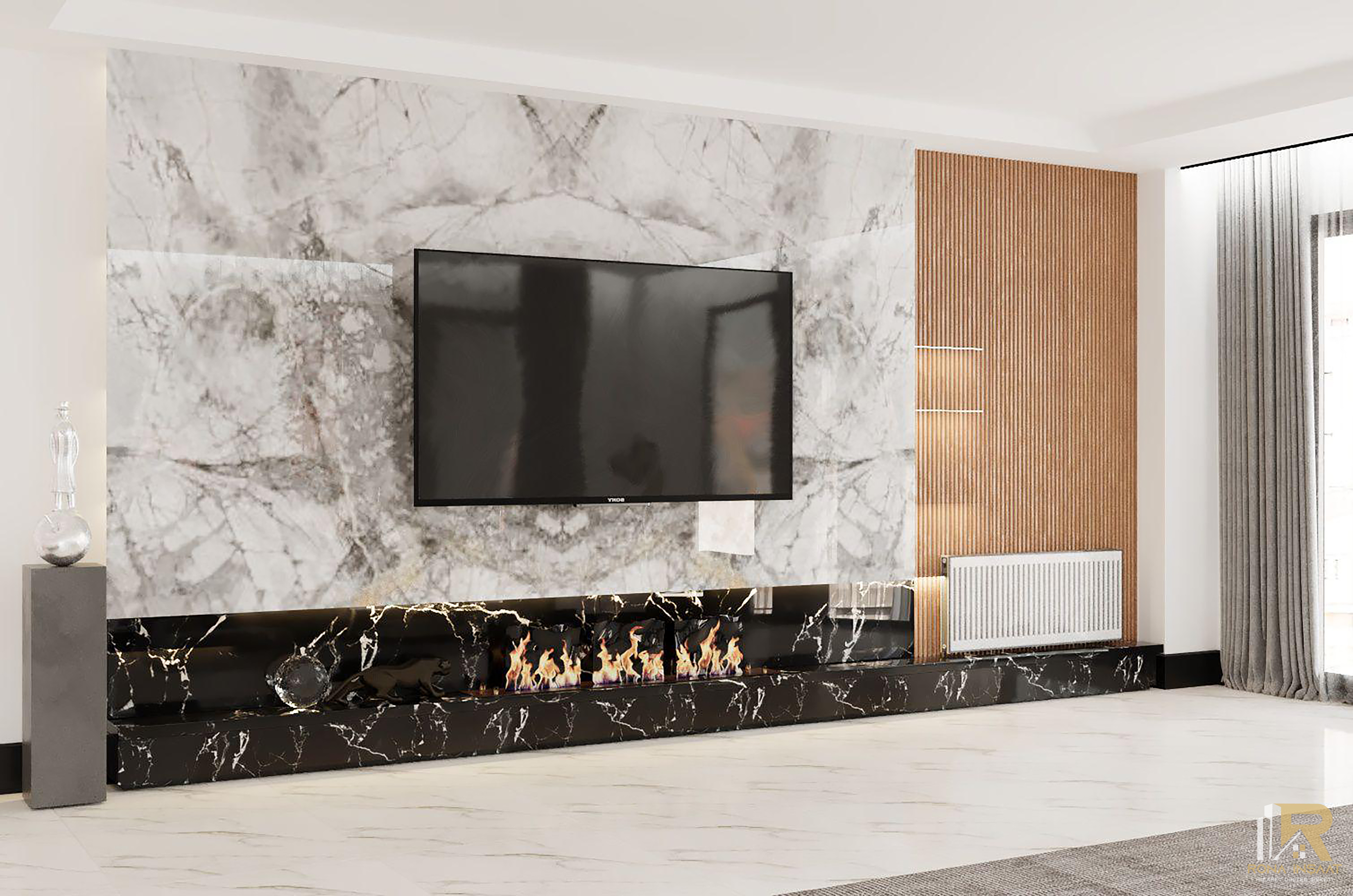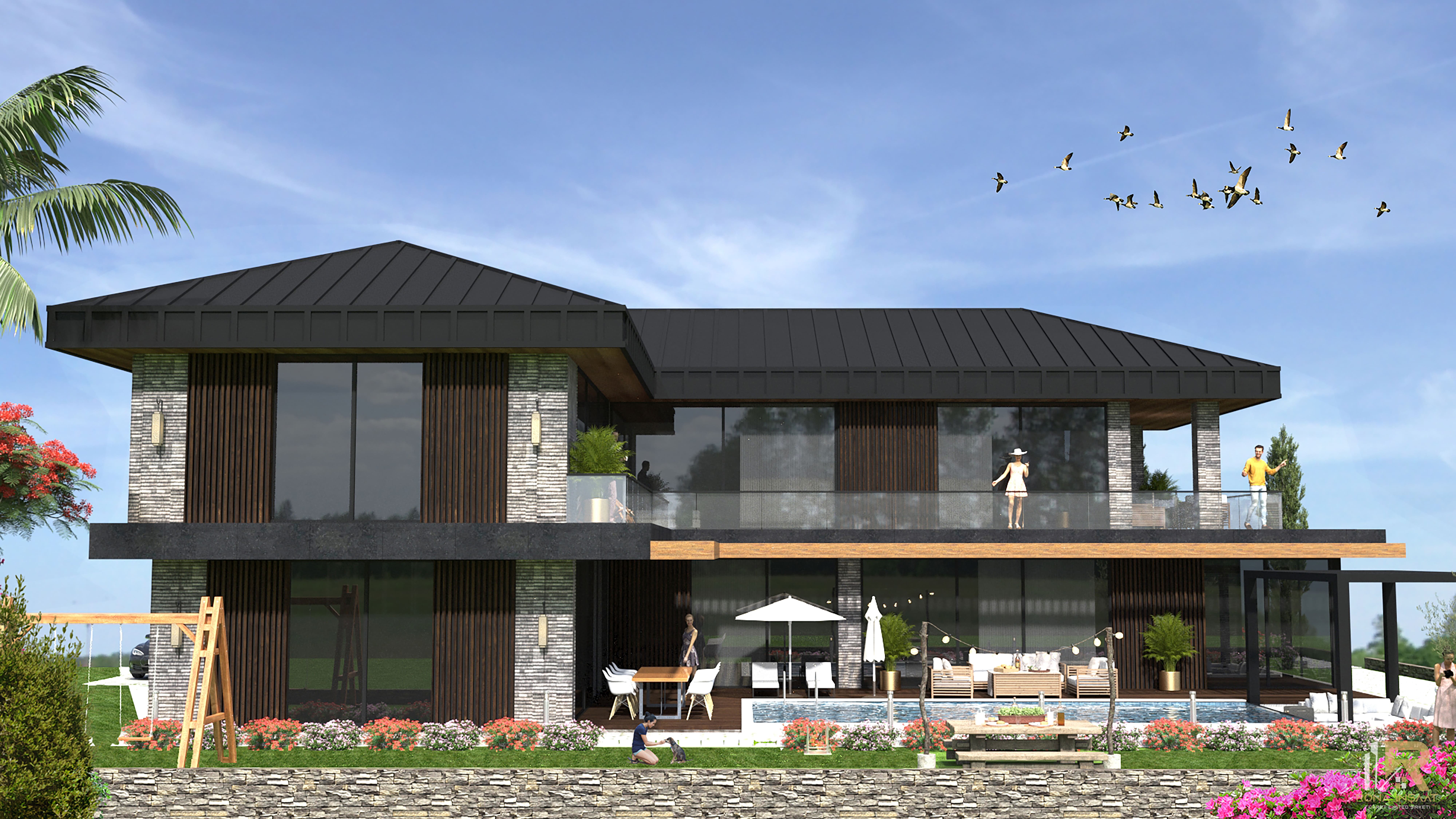 Projenin mimari dili, güçlü malzeme seçimleri ve modern çizgilerle desteklenmiştir: