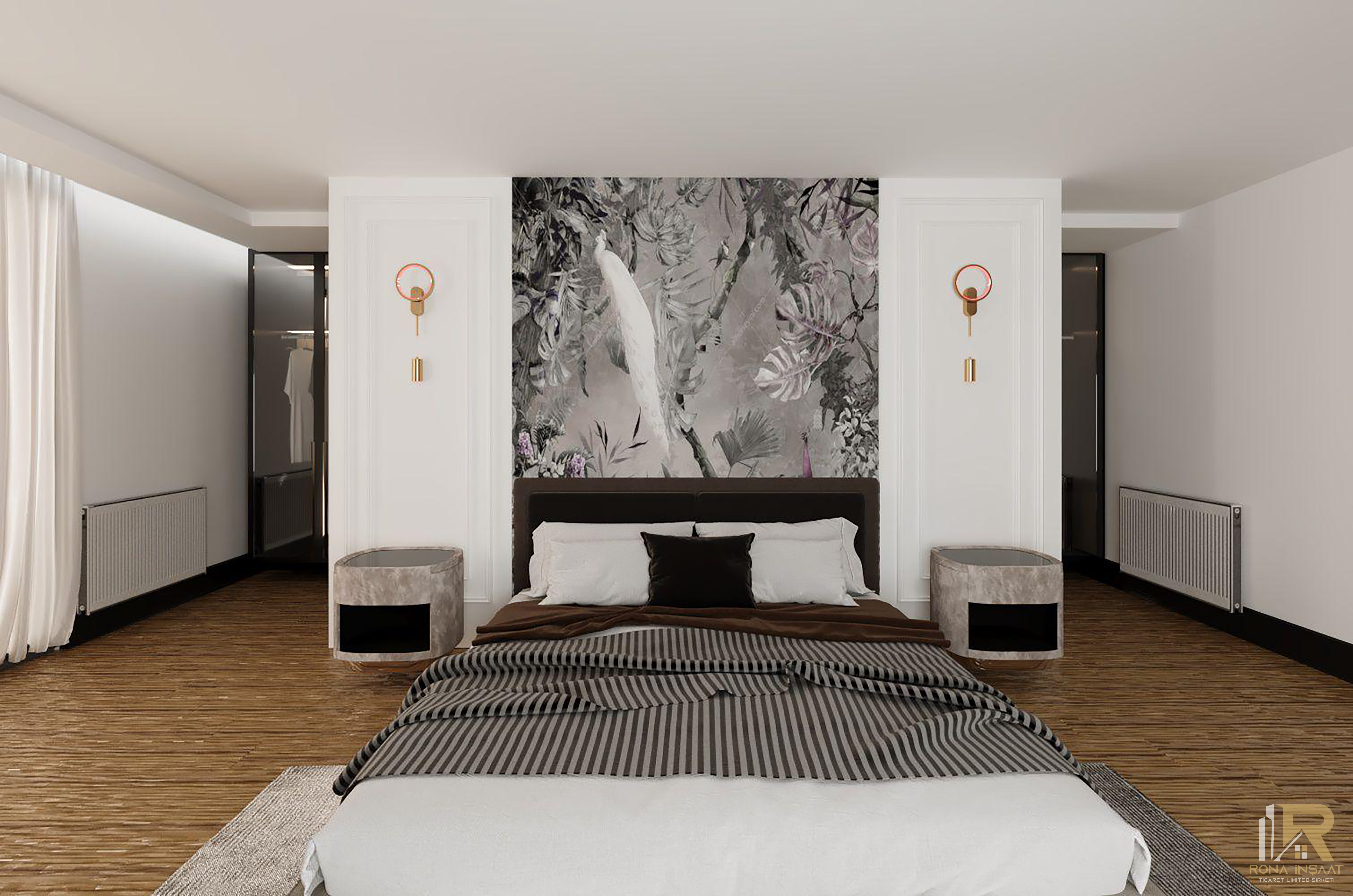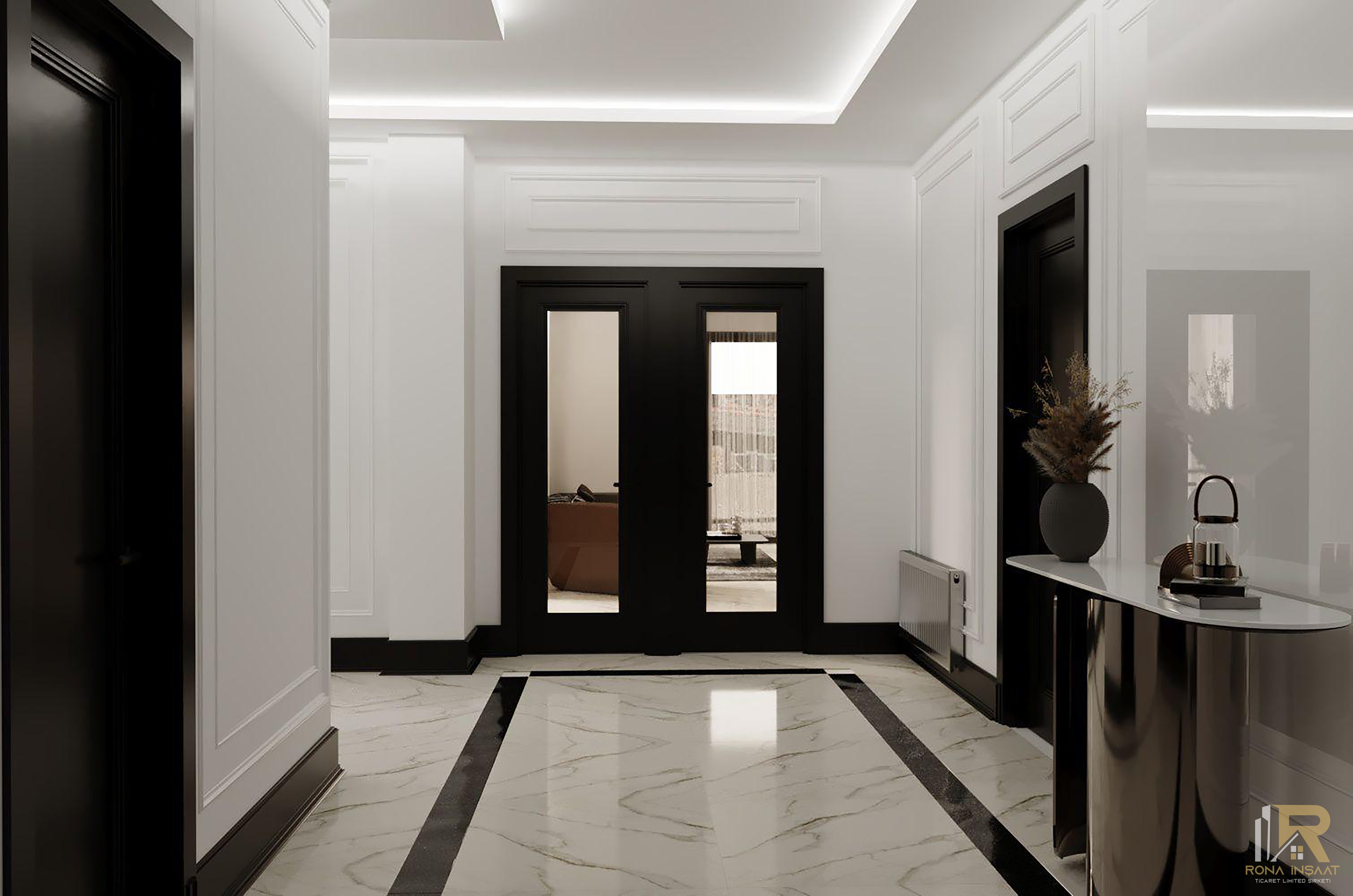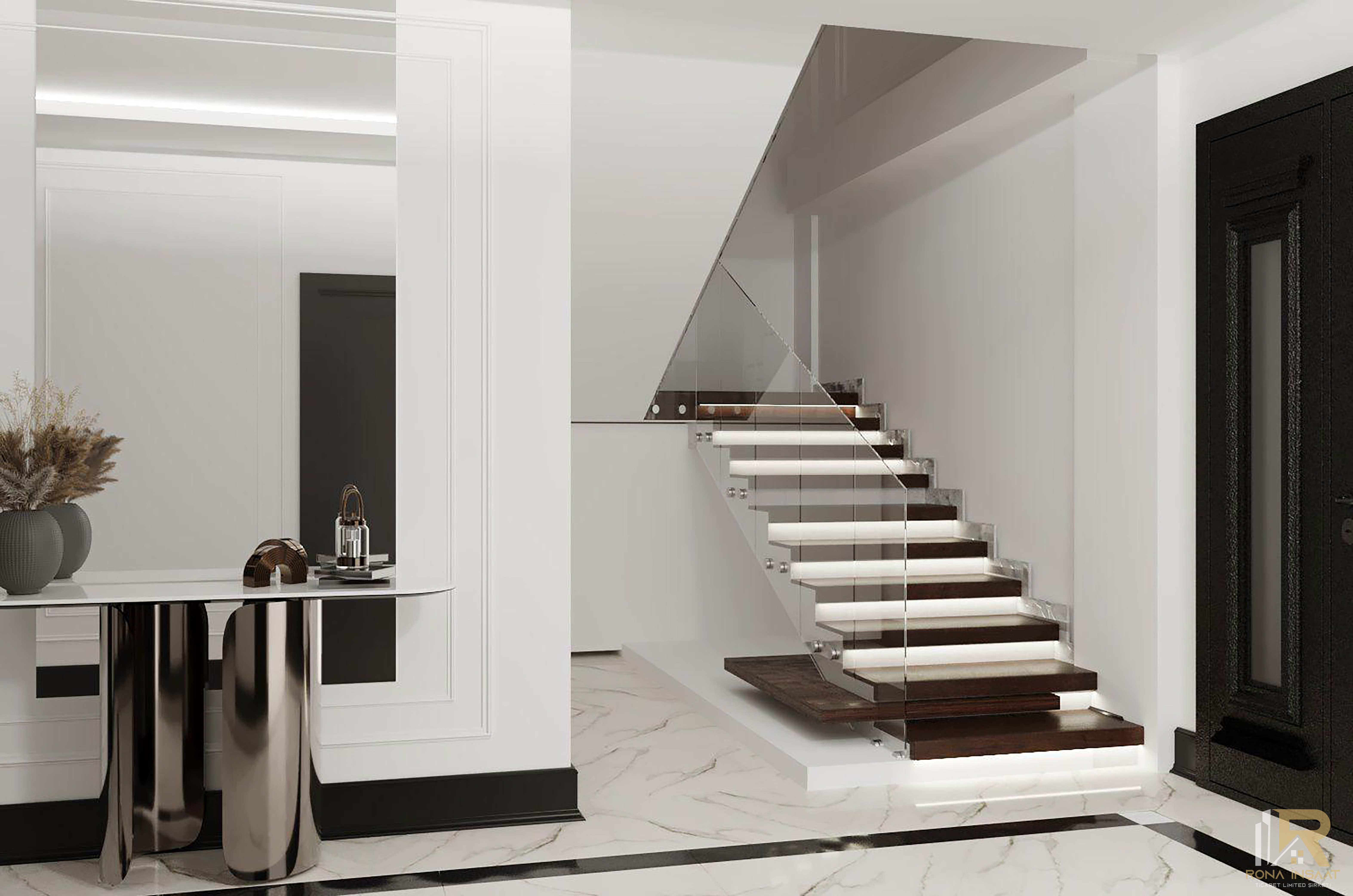 Merdiven altı aydınlatmaları, zarif tavan detayları ve lüks hissi veren malzeme dokunuşları projeye değer katar.