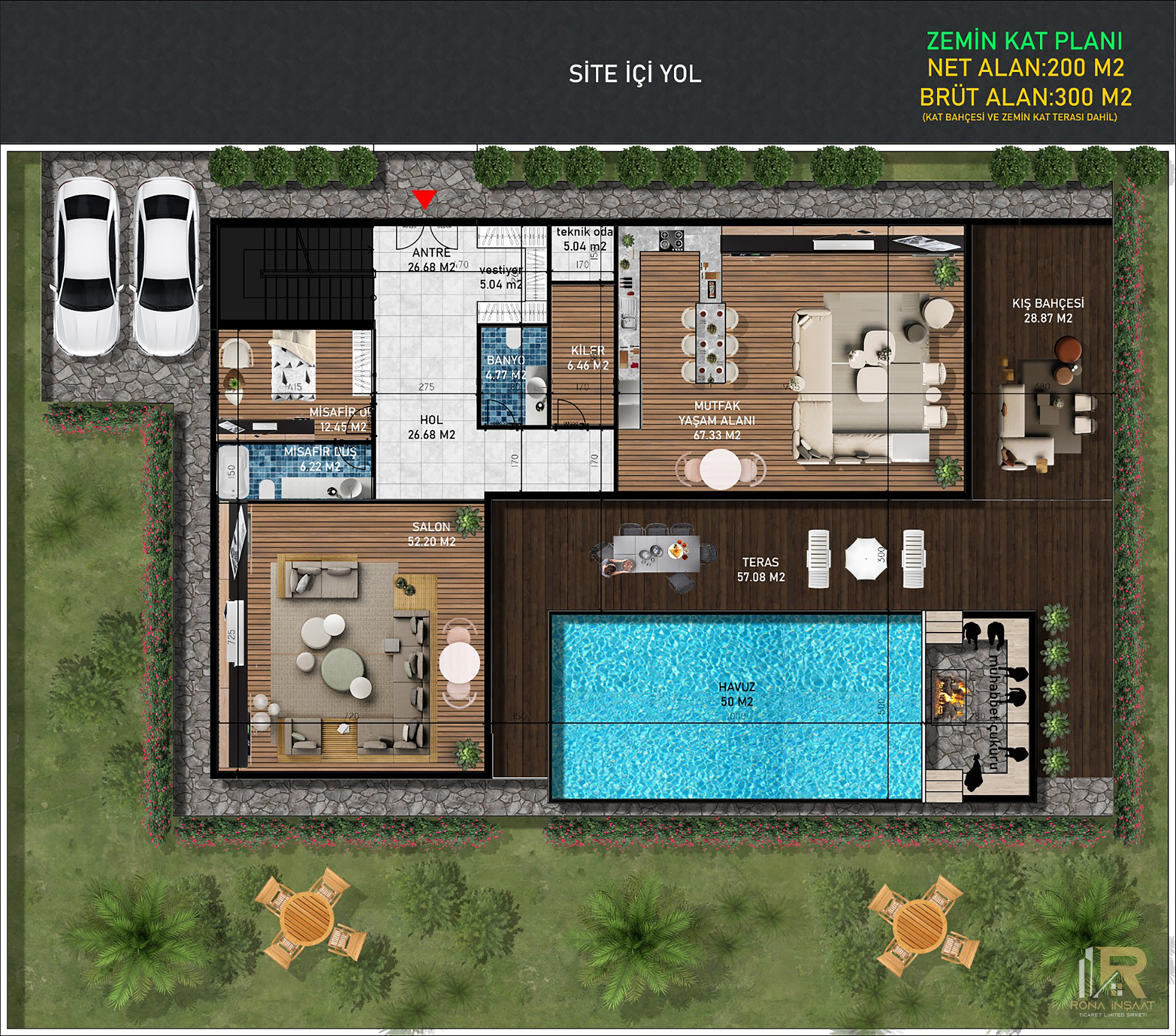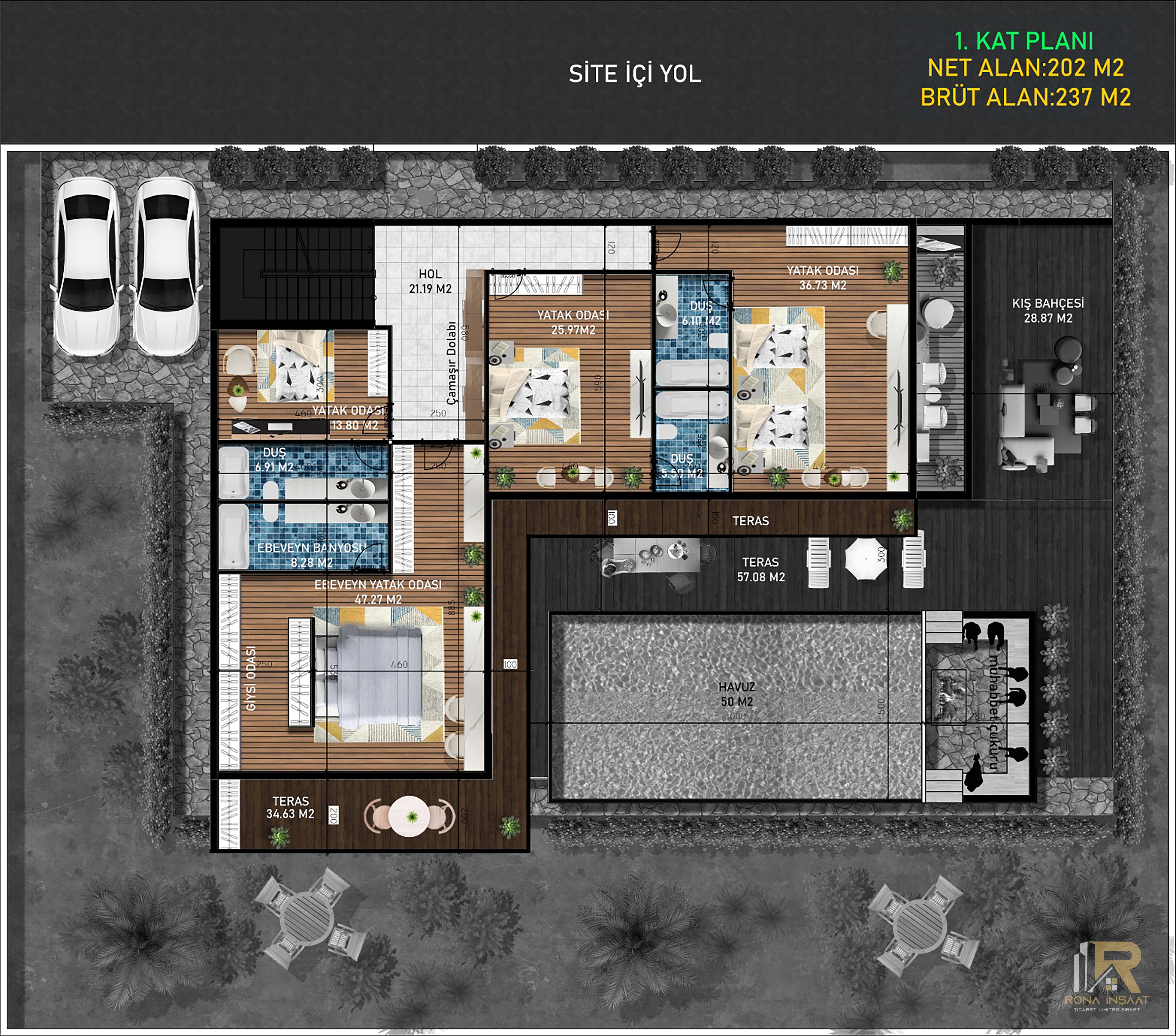Site içi yolun villaların arka kısmından ilerlemesi sayesinde bahçe, havuz ve teras alanları araç trafiğinden uzak, sakin ve huzurlu bir atmosfere dönüşür.